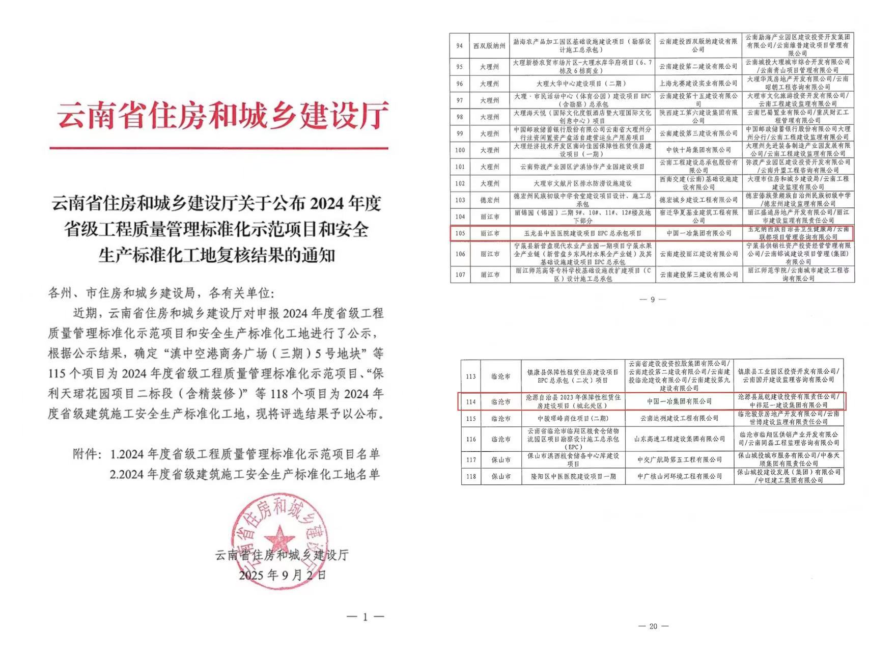 9月3日,云南省住房和城乡建设厅公布2024年省级工程质量管理标准化示范项目、安全生产标准化工地名单,中国一冶交通分公司承建的沧源县保障性租赁住房建设项目(城北片区)、玉龙县中医医院建设项目均获得两项省部级荣誉。